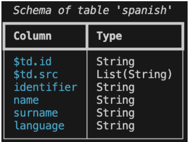 $ td table schema --collection tutorial --name spanish